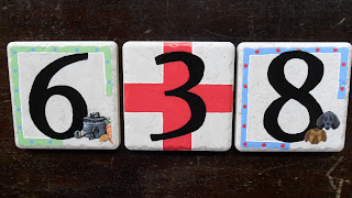 I so love to paint on tile. I have done oil paintings in the past, but more recently I have started to do custom address tiles. This is a set I just finished for a chef, a Brit and their dogs. I think they turned out pretty sweet!